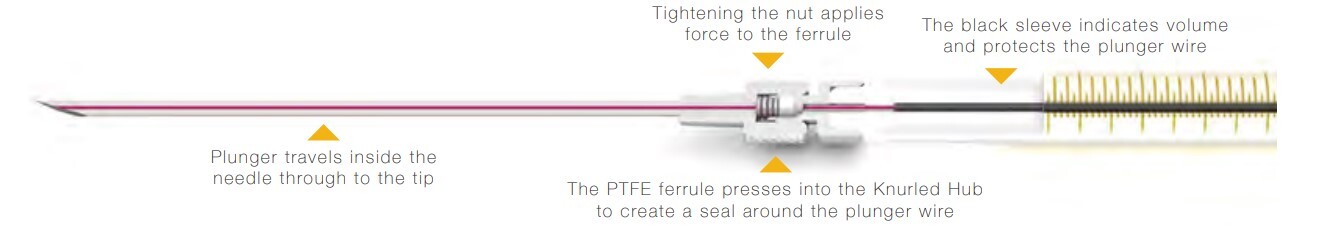 To support these minute dispensing volumes, the 7000 Series uses a tungsten plunger wire rather than a conventional larger plunger. Precision needle tolerances are matched to this wire so the syringe can deliver very small liquid volumes accurately and consistently in demanding analytical workflows.